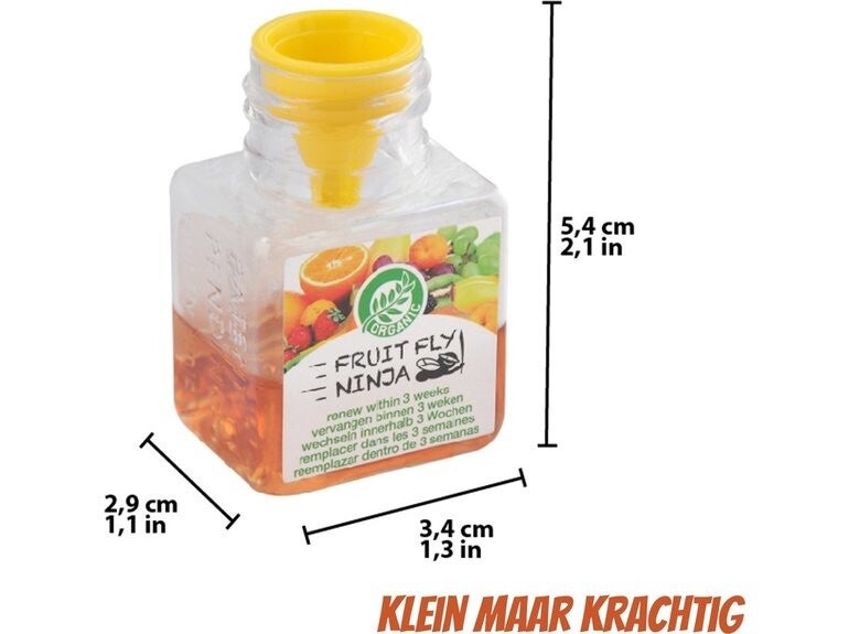 Houd er rekening mee dat Fruit Fly Ninja alleen werkt tegen fruitvliegjes, dus voor kleine zwarte vliegjes in de buurt van potplanten overweeg dan de aanschaf van de Plant Fly Ninja, de oplossing tegen rouwvliegen.