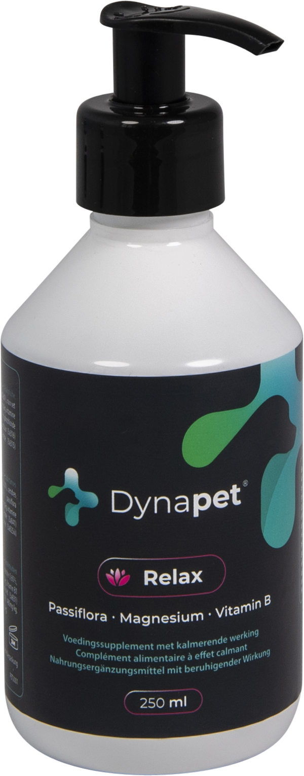 Wanneer je hond onrustig, nerveus of angstig is, of wanneer hij een stressvolle periode doormaakt zoals bv. tijdens de training, bij een verhuis of andere spannende gebeurtenissen, kan het Dynapet Relax supplement je hond helpen om zich te ontspannen en beter aan te passen. Dit voedingssupplement bevat verschillende B-vitaminen, passiebloem en magnesium voor een kalmerende en ontspannende werking.