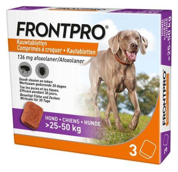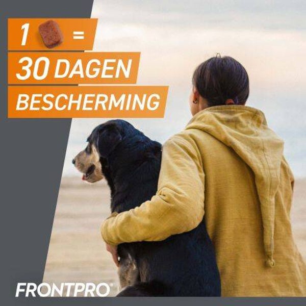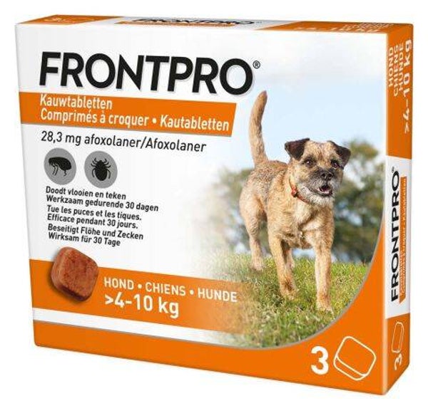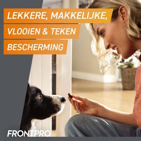 FRONTPRO® is een kauwtablet met een snelle en langdurige werking tegen vlooien en teken. FRONTPRO® is geschikt voor alle honden rassen met een leeftijd vanaf 8 weken en 2kg.
