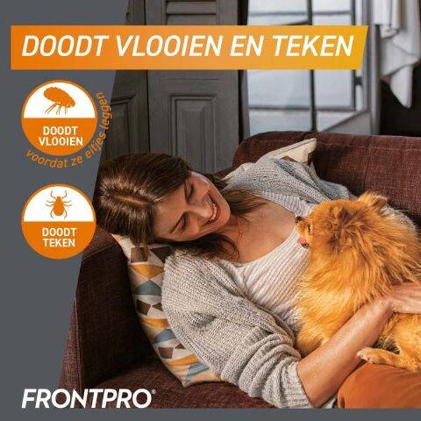 Werkt snel: doodt vlooien binnen 8 uur en teken binnen 48 uur. FRONTPRO® doodt vlooien bovendien voordat ze eitjes kunnen leggen en werkt een hele maand lang.