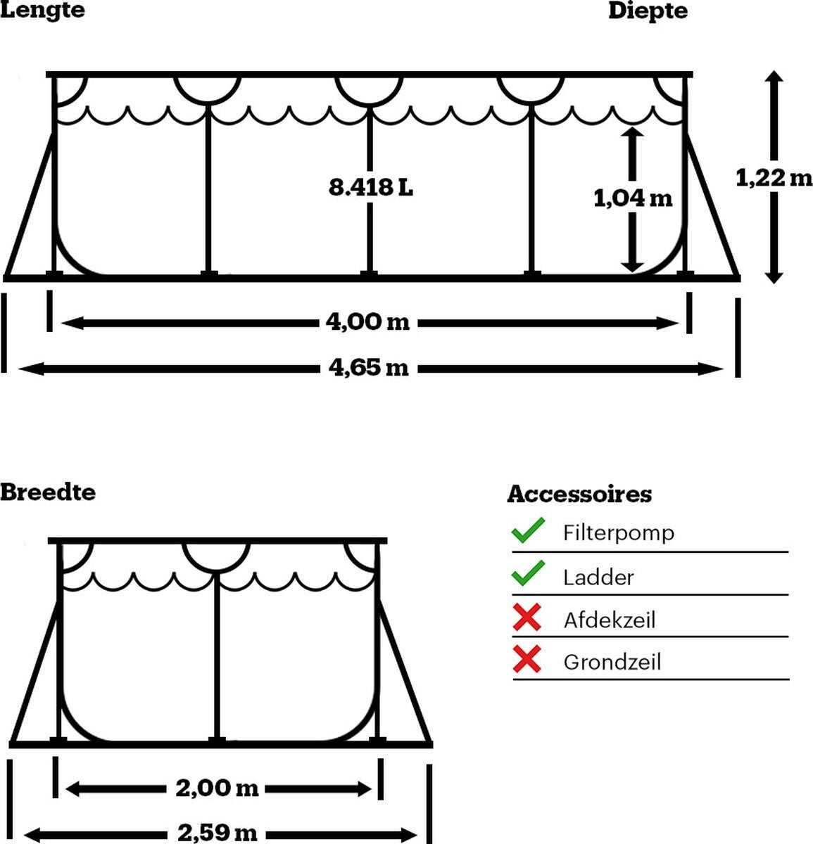 Merk Intex Serie Prism frame Model 400 x 200 x 100 cm Uitvoering Frame zwembad Vorm Rechthoek Afmeting 400 x 200 x 100 cm (lxbxh) Waterlijn 82 cm Liter inhoud 6836 liter Met pomp Ja, filterpomp Met accessoires Trap Inhoud Zwembad, reparatiesetje, filterpomp, zwembadtrap, afsluiting 32 mm Gewicht 67 kg Kleur Lichtgrijs Materiaal Polyester versterkt PVC Artikelnummer 26788