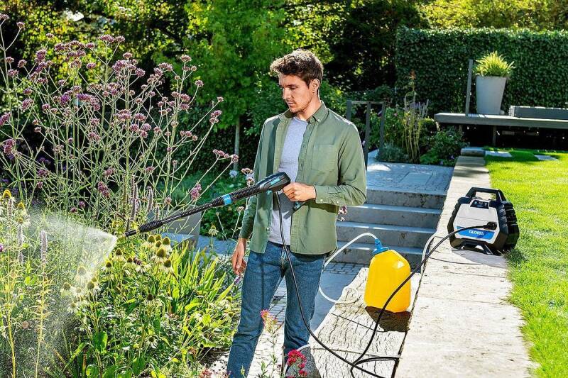 Steek de zuigslang van 5 m in een emmer het dichtstbijzijnde meer of de GLORIA UNVERSAL-container schakel het apparaat in selecteer het drukniveau en je kunt aan de slag. Met de 4-in-1 multifunctionele sproeier kan de gebruiker kiezen of hij met een platte straal (15 graden /60 graden ) een turbostraal of een puntstraal wil werken en een extra broeshulpstuk maakt van de MultiJet 36V een mobiele gieter.